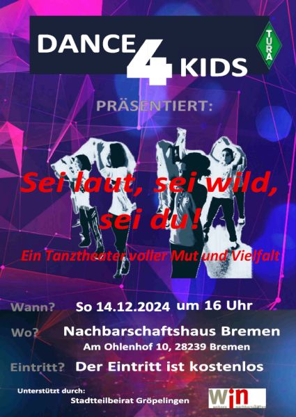 Das Projekt „Dance4Kids“ bei Tura wurde in diesem Jahr bereits im zwölften Jahr durchgeführt. Unterstützt und gefördert wurde es mit Mitteln aus dem Projekt „Wohnen in Nachbarschaften“ (WiN). Wer bei der nächsten Folge des Projekts mitmachen will, hat dazu nach den Weihnachtsferien die Gelegenheit. Die Übungsnachmittage im Tura-Vereinszentrum an der Lissaer Straße 60 finden dienstags von 17 bis 18 Uhr statt. Darüber hinaus sind mehrere Wochenend-Workshops geplant. Weitere Informationen bei Tura, Bert-Trautmann-Platz/Lissaer Straße 60, Telefon 61 34 10, E-Mail info@turabremen.de.