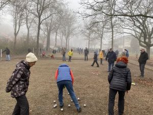 Bei recht angenehmen Temperaturen um die 8 Grad, Windstille und leichtem Nebelschwaden zu Beginn (Foto) , spielten 28 Gäste und 17 aus der Tura Boulegruppe alle drei Spielrunden mit! Auch im Winter kann Boulespielen im Freien Spaß machen und gesund sein!